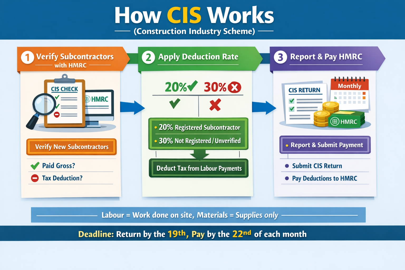 The Construction Industry Scheme (CIS) requires contractors to verify subcontractors and apply the correct deduction rate—so the right taxis withheld at source. We help you get the checks, rates, and reporting right from day one.